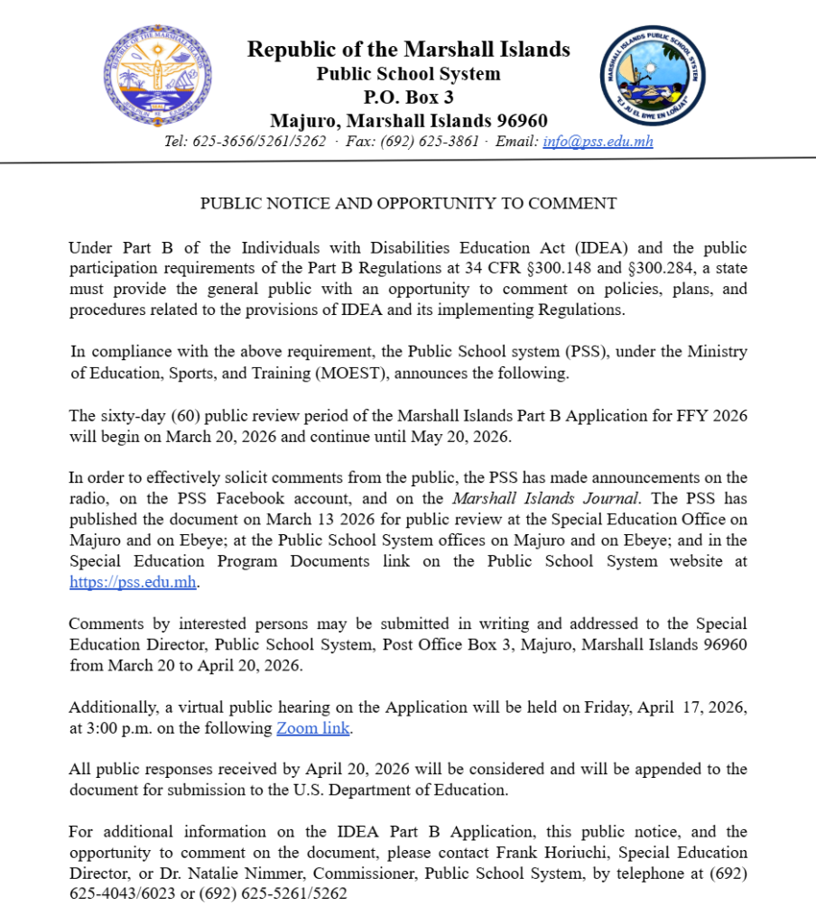 Our students are the key to a peaceful and productive Marshall Islands. They will be independent critical thinkers, with bi-cultural skills, knowledge and values which will allow them to thrive in both atoll and global environments.